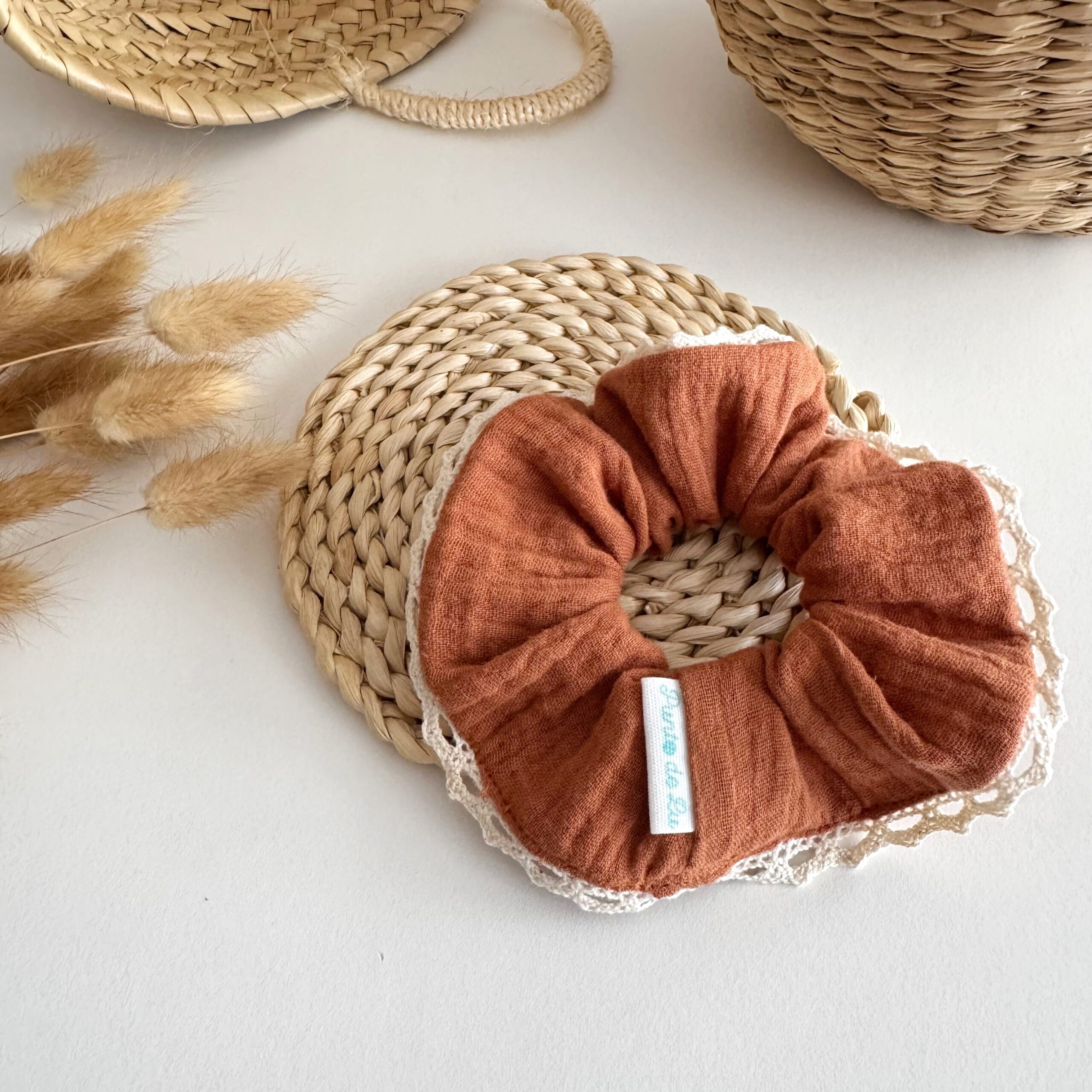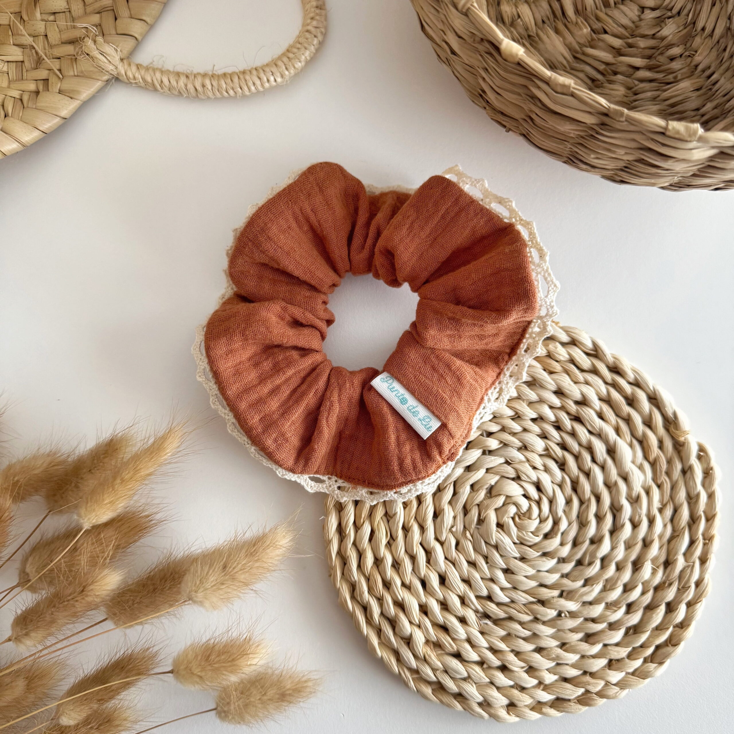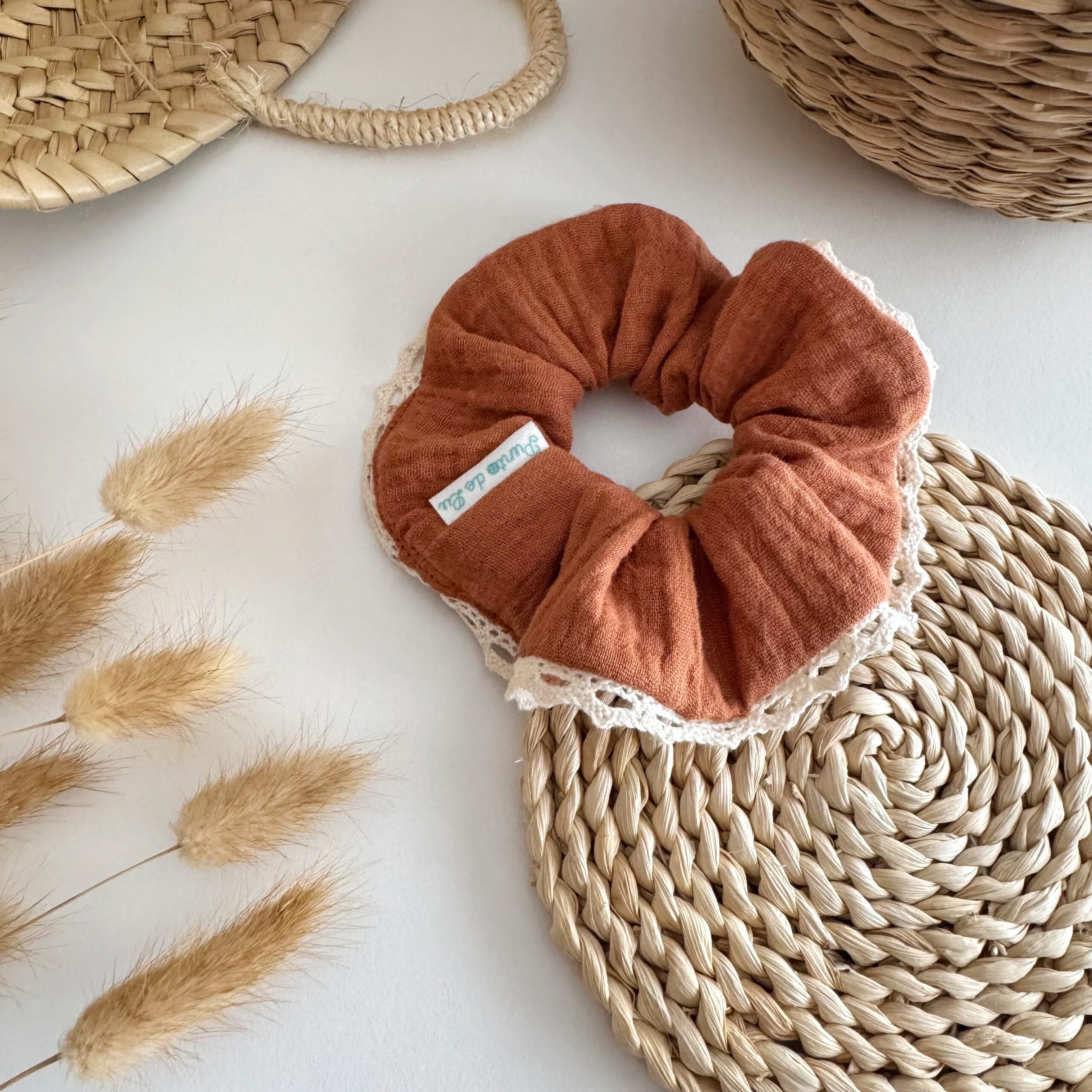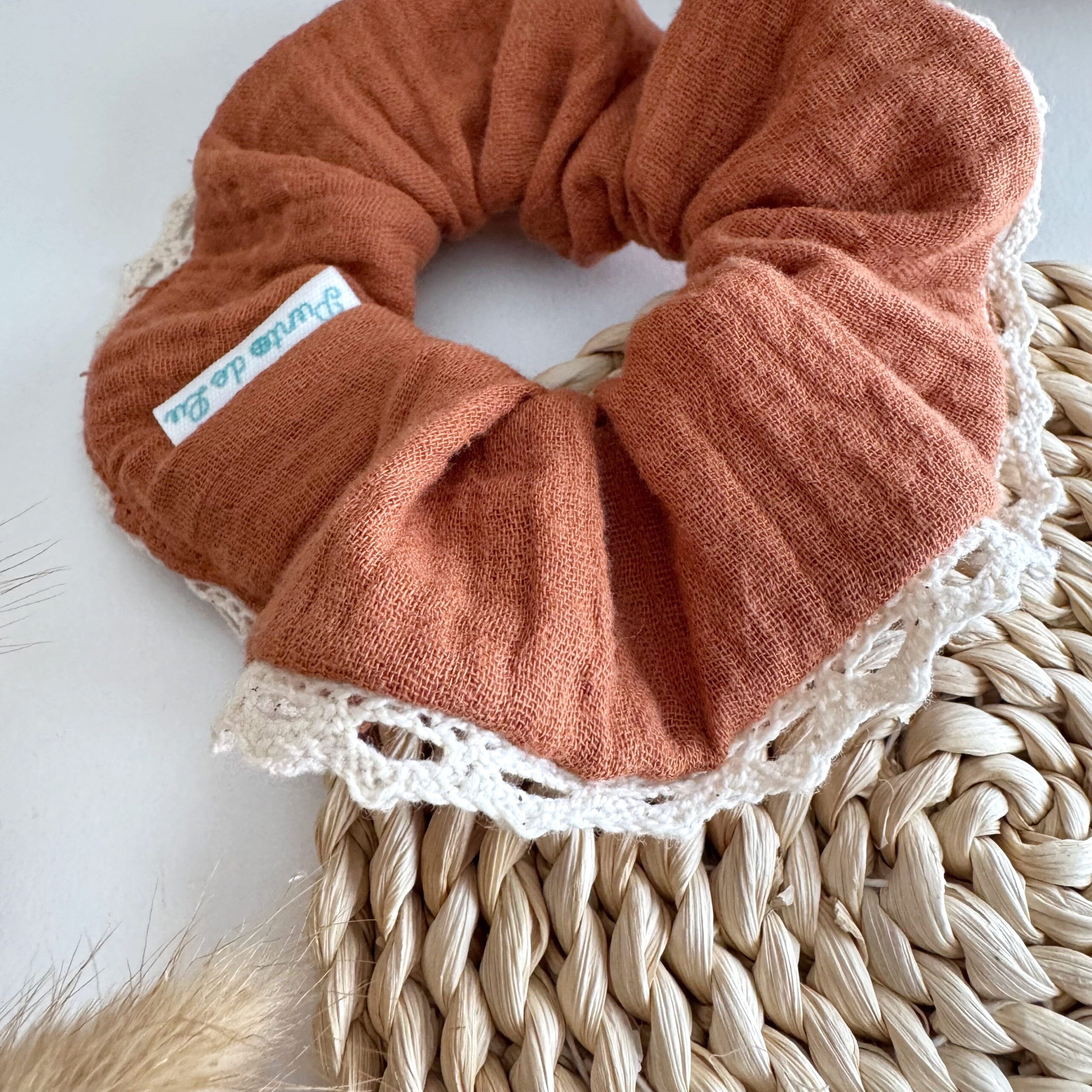 Hecho a mano con mucho mimo. Nuestro coletero Canela, confeccionado tejido de doble gasa 100% y remate de encaje, es un complemento pensado para nosotras porque, además de ser tendencia, es gustosito y… ¡Le da estilo a tu muñeca o a tu pelo!